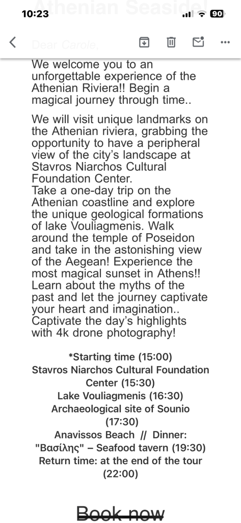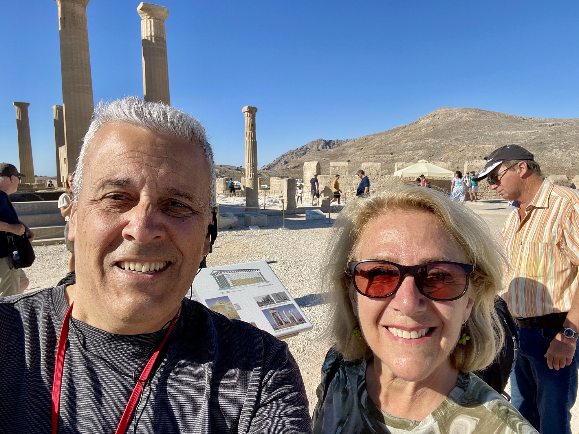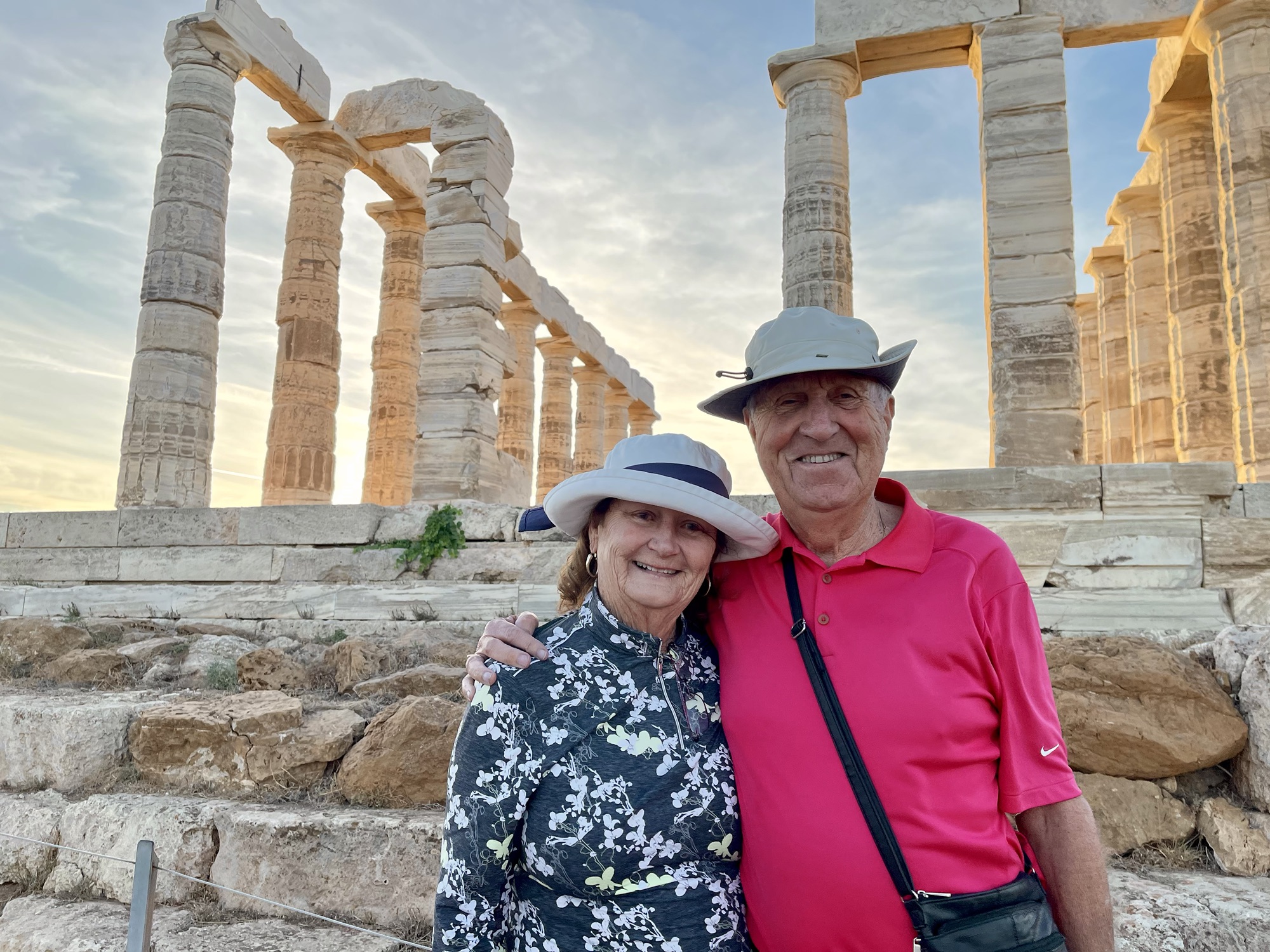 Resultó bien nuestro viaje. Los dos amigos que nos arrendaron el departamento nos llevaron en un auto amplio y seguro a conocer Grecia. Ahora trabajan en la industria del turismo después de haber estudiado otra disciplina. El rubro en que están es competitivo, pero no se quejan, les va bien, tienen clientes y no requiere soportar a jefes de mal humor. Nos subieron a un auto un poco grande para la ciudad. La manejada por Atenas me pareció como una excursión por Santiago de Chile. Los bocinazos y la gente por las veredas me recordaron a mi país de origen, Fuimos con nuestros amigos Tom y Mary Grace York, también llegados de Michigan varios días antes. En el camino hacia el cabo de Sunio, a 65 kilometros al sureste de Atenas, paseamos por la riviera atenense y visitamos el lago Vouliagmeni de aguas que algunos le asignan propiedades curativas. El cabo de Sunio es conocido por los templos que dominan el mar a una altura de 60 metros: uno dedicado a Atenea y y el otro a Poseidón. El templo fue erigido en el siglo V a.c.