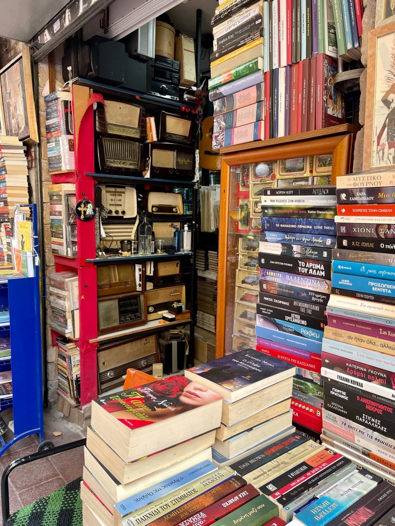 Ayer por la tarde encontramos una librería recomendada por un guía que tomamos en una tour culinaria por Athenas. Politeiane se llama la librería, ubicada muy cerca del hotel. Aquí en Atenas todo queda cerca. Compré tres libros como a cuatro euros cada uno. No quería leer nada relacionado con más guerras o historia muy pasada. Ya me va quedando poco tiempo. Quiero leer textos contemporáneos, que al menos en mi caso siento más cercanos. Los tres que escogí son autores griegos y estaban traducidos al inglés: “Short Stories” de Stergios Chatzikyriakids, “Good Friday vigil” de Yorgus Ioannou y “Gioconda” de Nikos Kokantzis, traducido al inglés por el mismo autor. Leo en la Internet que Kokantzis compitió para el Nobel de literatura que finalmente ganó Albert Camus. Cómo en toda competencia, pareciera que para el Nobel también se necesita mucha suerte, compadres, y una situación política o geopolítica favorable.