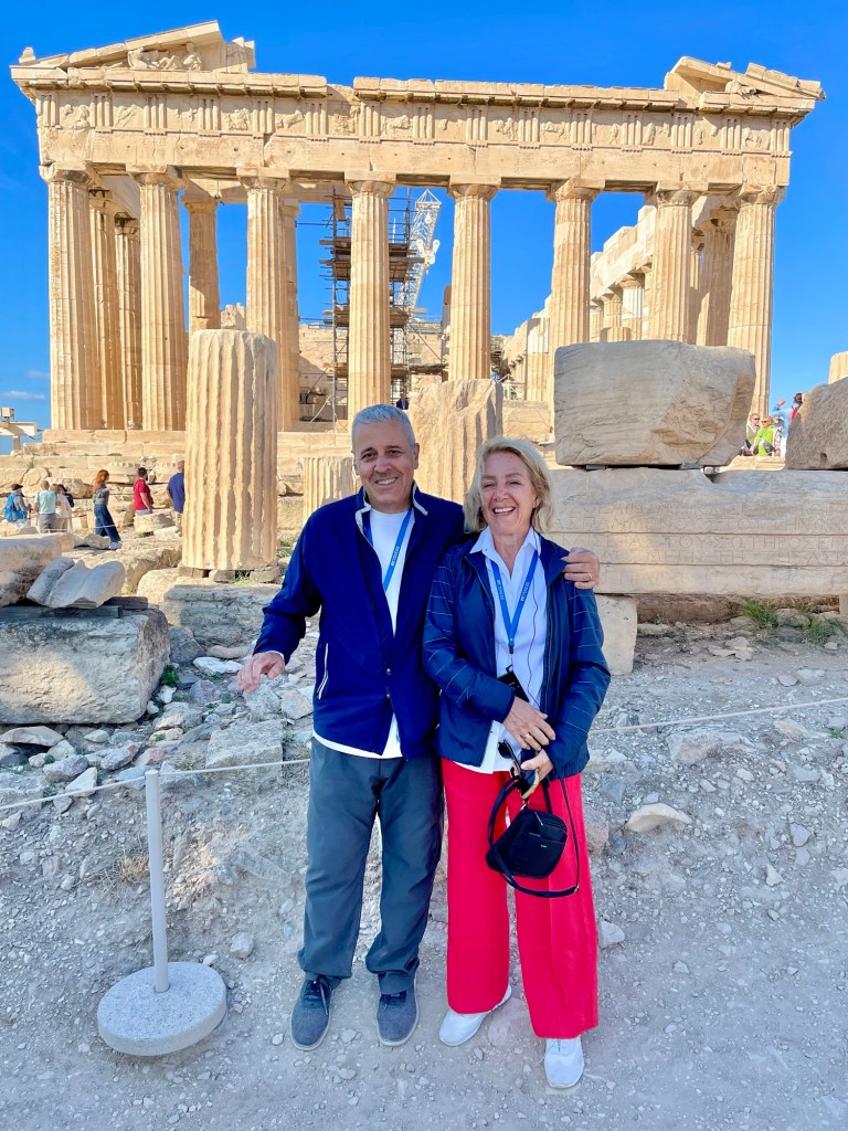 Es curioso, pero uno en viajes como este no solo aprende de historia, pero como que te comunicas con los que lo visitaron antes. Cuando ves el Partenón por primera vez es como visitar un sitio, una imagen que tantos otros han visto antes, que por breves momentos también los recuerdas a ellos, a ellas. Antepasados ya vaporizados que en su tiempo se embarcaron en una peregrinación parecida a la nuestra, como el padre de la esposa de mi hermano Alberto, que cuando estuvo aquí se emocionó. Mi hermano me cuenta por mensaje texto que lloró, que Rodolfo lloró cuando vio el Partenón por vez primera. Él fue un arquitecto chileno, mi país de origen, de manera que la historia y el diseño le golpearon con más fuerza. Yo me impresioné, pero más que nada pensando en la gente que, como Rodolfo, estuvieron aquí antes, frente a este majestuoso monumento que desafía el paso del tiempo y que por breves momentos se nos aparece como algo que finalmente se acerca a la inmortalidad, la toca.
