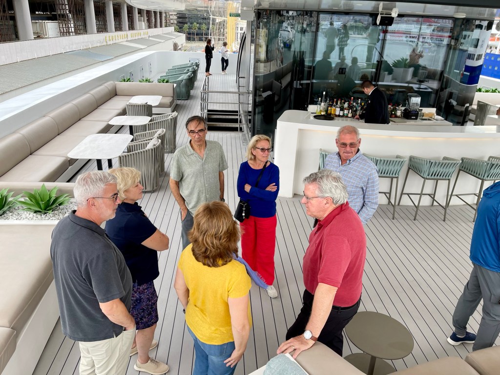 En el retrato de más abajo, estamos recién llegados a la embarcación y conversamos en el séptimo piso del barco, el más alto, con los amigos llegados también de los Estados Unidos. Ahí está John Egenberger, de camiseta roja, al lado de su señora, Nancy. Él es médico cirujano, experto en cirugías del colon. A él le consulté que pensaba del médico que me operó de dos hernias este año, una umbilical y la otra inguinal. Nancy trabaja en una escuela. Nuestro amigo Richard Santucci, de polera negra, es también médico, experto en cirugía transgender, es uno de los líderes mundiales en este tipo de cirugías. Sabe construir los penes más perfectos y formidables del mundo. Me confesó que su señora, Christine, lo acompaña poco a los simposios porque sus colegas médicos solo quieren conversar de penes y erecciones con su marido. Christine no pudo llegar porque está ayudando a su hija que acaba de tener un bebé; ya tenía todo pagado, pero no pudo venir con el grupo. Richard fue el médico que me aconsejó qué médico ver cuando me descubrieron el cáncer a la próstata. Me decidí por una operación porque sentía que no podía vivir tranquilo controlando a ese dragón que me quería acortar la vida. Me cuenta que esa no es una operación que puede realizar cualquier médico; una complicación común es quedar usando pañales para toda la vida. Nos contó que hace poco un amigo lo llamó para consultarle detalles sobre el médico que lo iba a operar en dos días más. Richard le dijo que de ninguna manera se operara con ese médico, y que si lo hacia fuera a la farmacia más cercana para escoger qué colores de pañales le gustaría usar para el resto de su vida. A la izquierda de Richard vemos a Carole, Sly, y Pilar, mi esposa. Tommy York, de camisa celeste, a la izquierda de Pilar, es dueño de una Deli en Ann Arbor, Michigan, un café estilo europeo ubicado a diez millas de nuestra casa.