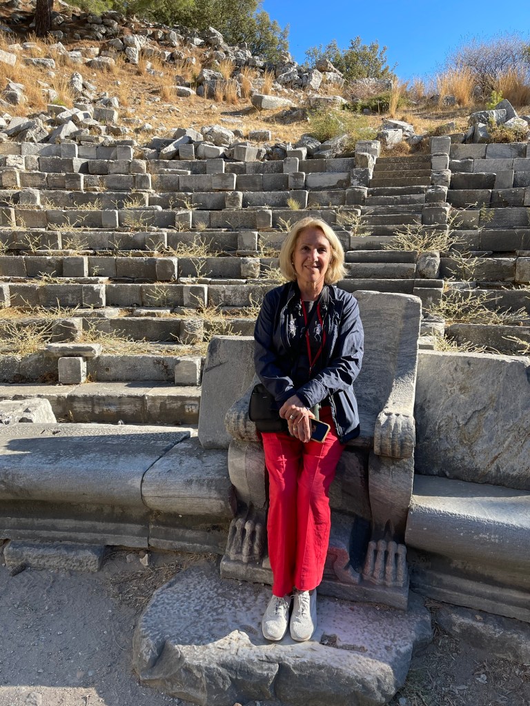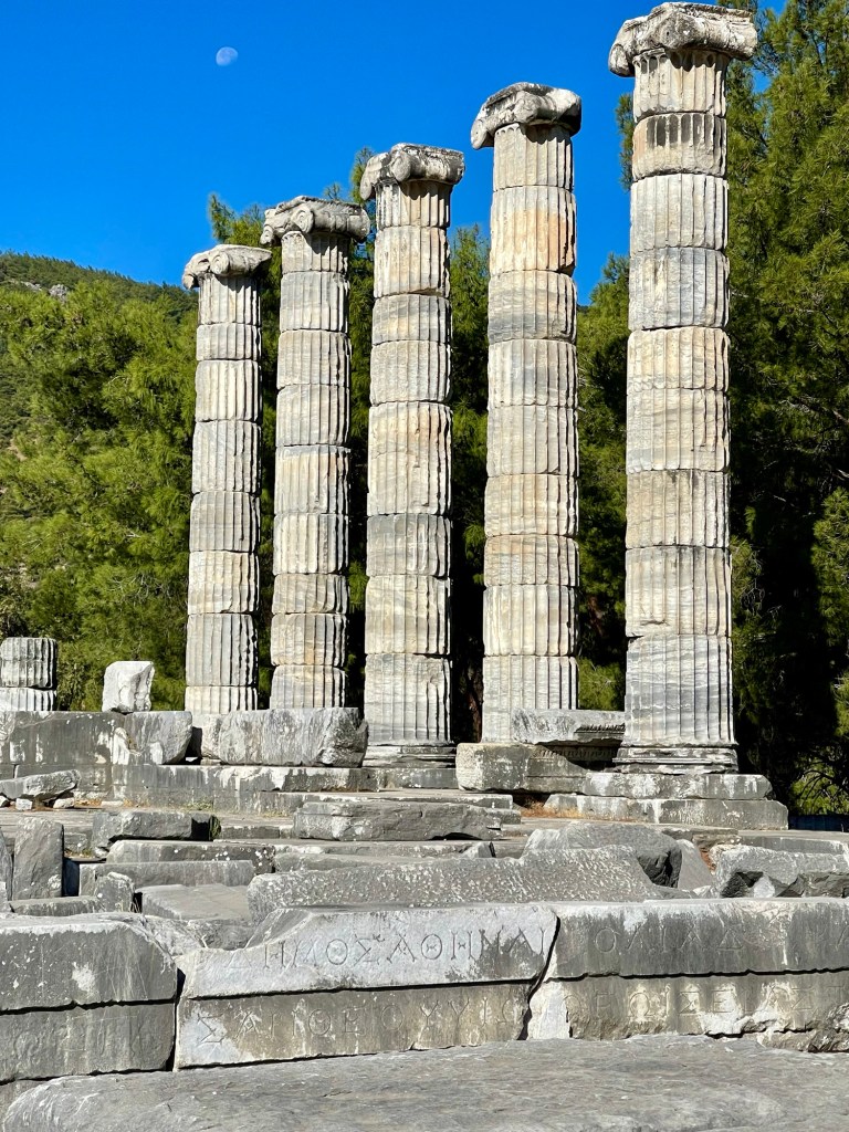 La primera ciudad que visitamos fue Priene, una ciudad que antes estaba en el mar, era un puerto, pero que con el tiempo los depósitos del río Meandro alejaron la costa y convirtieron la ciudad en un pueblo tierra adentro. Lo más interesante fue el Templo de Atener donde han reconstruido cinco pilares solamente. Todo lo demás está en el suelo. La destrucción que vemos es solo por el tiempo transcurrido y los terremotos. Le pregunté al guía, al ver la cantidad de piedras desparramadas por todos lados, si habían tratado de restaurar la ciudad, Nada ha sido restaurado, nos dijo, por el costo que eso implica. Pero lugares más concurridos han sido parcialmente reconstruidos porque atraen más público y se pueden financiar.