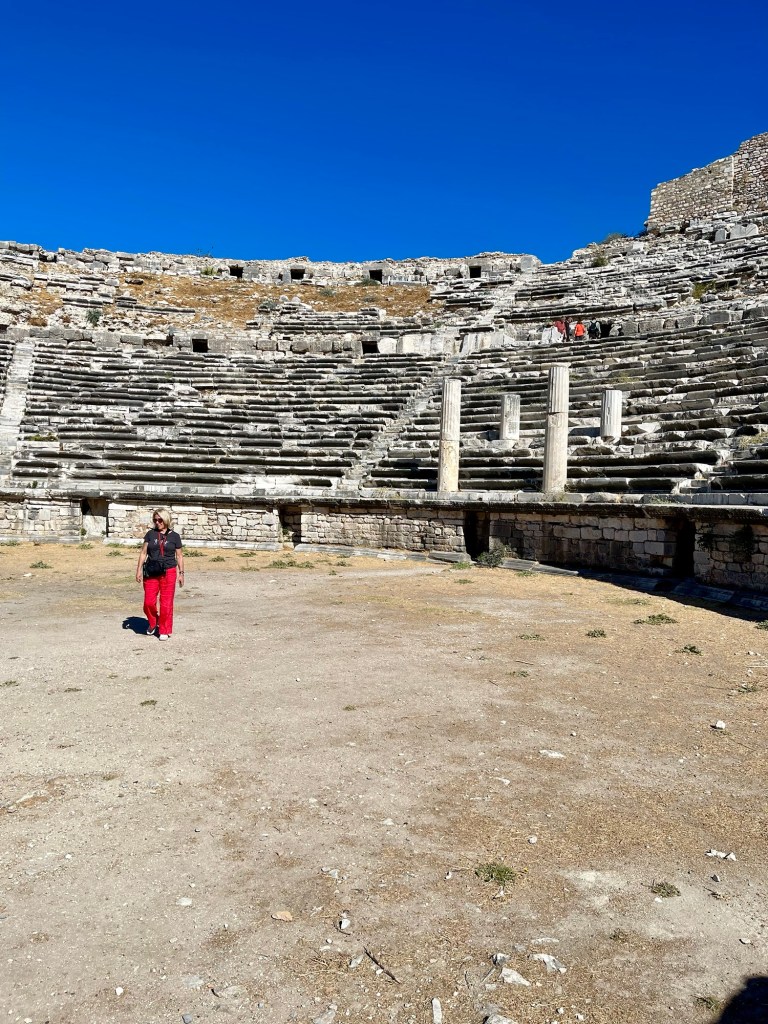 En Priene vimos también el teatro acústico de los griegos, que forma un semicírculo, (en lugar de la típica circunferencia completa de un anfiteatro romano) donde se presentaban obras artísticas y más cercanas a la cultura que el entretenimiento calculado de los romanos. Por eso el suelo donde se presentan los artistas está al mismo nivel que el de los espectadores. En el. Anfiteatro romano la zona de actuación estaba hundida en el suelo para que las fieras fueran contenidas con mallas. No tiene eco cuando está repleto de gente, nos dice el guía.
