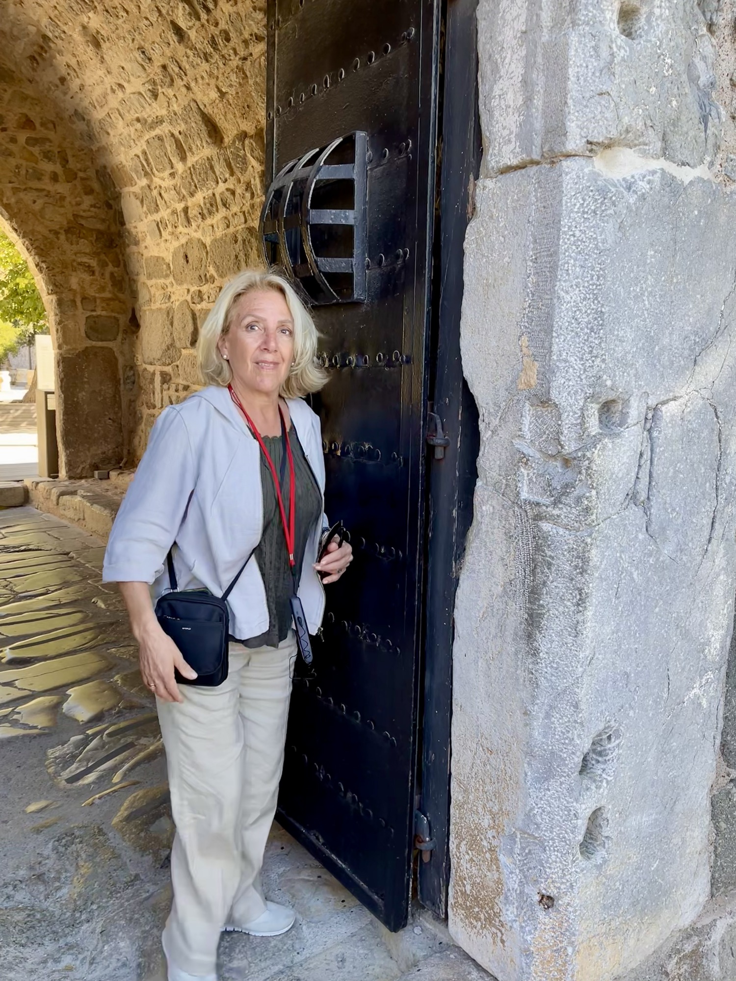 El tour lo iniciamos temprano por la mañana, de manera que logramos evitar la invasión de turistas como nosotros. El guía nos cuenta que en Lindos no se permiten nuevas construcciones. Vemos las casas blancas tradicionales, construidas en otro siglo por los capitanes de los barcos. Las callejuelas son angostas para protegerse del sol y de los piratas de otro siglo. Sly logró afirmarse a las murallas de piedra cuando regresábamos al autobús.