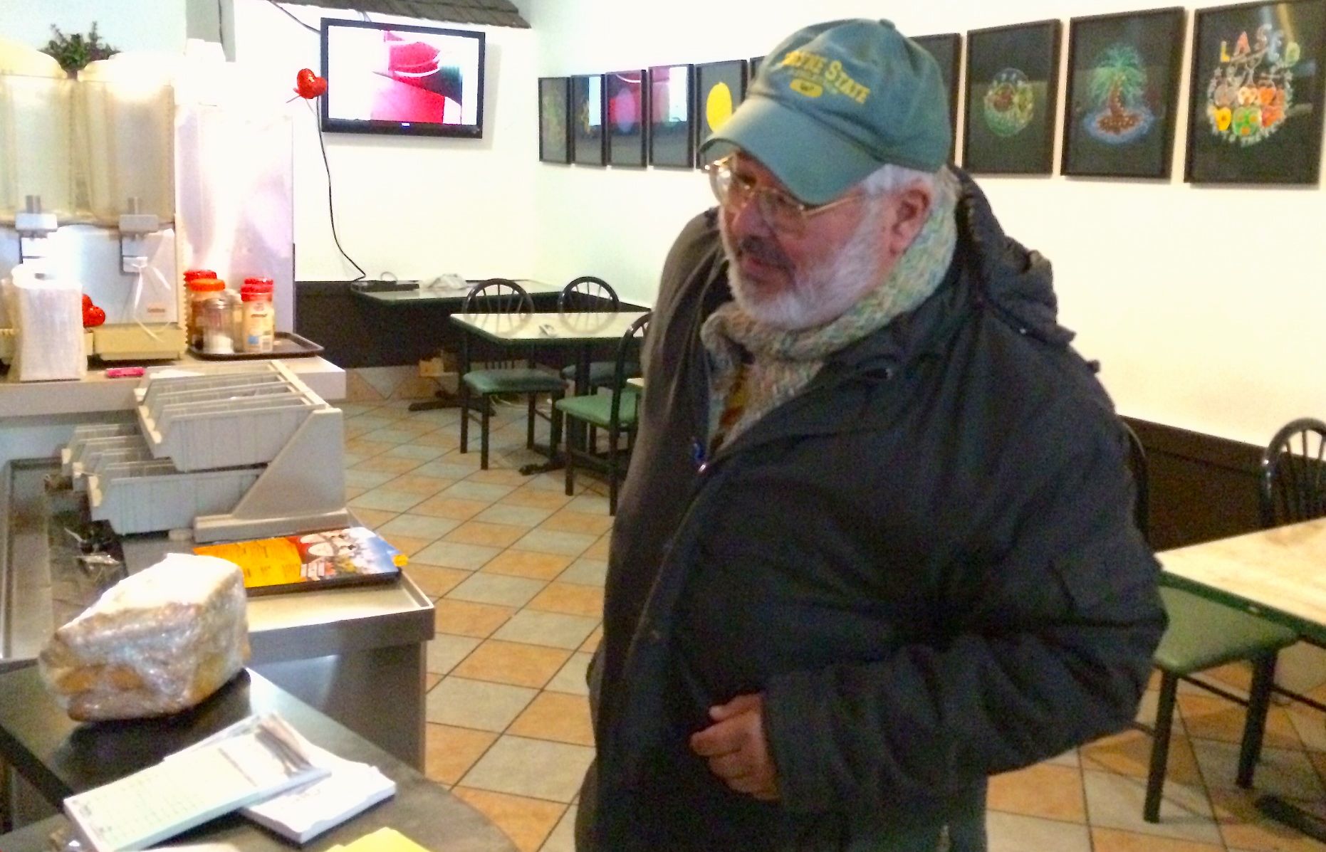 En el restarán “Parrilladas Patagonia” ubicado en Vernon Street en el corazón mismo del Mexican Town, en Detroit. Este cliente está comprando cuatro empanadas (que se ven envueltas en ese plástico). El es uno de los artistas del Mexican Town. Sus cuadros se pueden ver colgados sobre las murallas del restorán. Son dibujos pintados sobre género y sobre poleras.